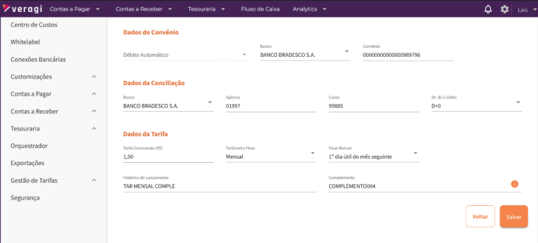 A partir do cadastro unitário de tarifas, a plataforma permite que sua empresa identifique e liste todas as tarifas cobradas aos convênios ativos para cada produto e canal de pagamento dos seus parceiros financeiros. Isso permite que você tenha uma visão clara e precisa de todos os custos associados aos seus processos de pagamento.